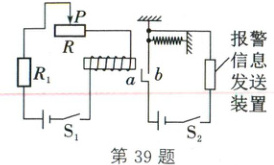 39. (2025·凉山)传感器在“物联网”中担负着信息采集的重要任务,可以实现“提醒”和“报警”功能。某型号的温度自动报警装置由热敏电阻作为传感器制作而成,其简易电路图如下。已知热敏电阻 R₁ 的阻值随温度升高而减小,若电源电压保持不变,滑动变阻器 R 的滑片 P 在某位置不变,闭合开关 S₁ 和 S₂,此时装置未报警。下列说法正确的是(