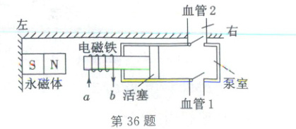 36. (2025·广州)医学上用“人工心脏泵”替代心脏推动血液循环,如图是其工作原理的简图,活塞在电磁铁的带动下左右移动,代表心脏的舒张和收缩。“人工心脏泵”正常工作过程中,电磁铁的电流从 a 流向 b 时,则(
