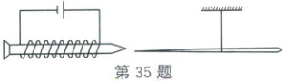35. (2025·菏泽)小明在户外实践中,利用随身所带物品制作了简易指南针,他首先利用电池、带绝缘皮的导线、铁钉制成电磁铁,然后将缝衣针磁化并用细线水平悬挂,最后将两者靠近,静止时位置关系如图所示。下列说法正确的是(