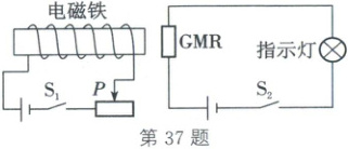 37. (2025·龙东地区)如图,电路中的 GMR 是巨磁电阻(其阻值随周围磁场强度的增强而减小),当开关 S₁ 和 S₂ 闭合时,将滑片 P 向左移动,下列说法正确的是(