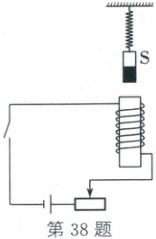 38. (2025·宜宾)如图,磁铁 S 极与弹簧连接,竖直悬挂于电磁铁的正上方,电源电压不变。闭合开关后,向右缓慢移动滑动变阻器滑片,下列判断正确的是(
