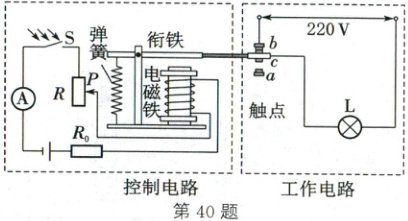 40. (2025·广元)如图所示是某学校路灯的智能照明电路。S 为光敏开关,天暗时 S 自动断开,天亮时 S 自动闭合;R 为滑动变阻器。下列说法正确的是(
