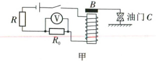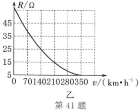 41. (2025·自贡)图甲为某无人机内发动机限速的简化电路,当飞行速度达到 350 km/h 时,衔铁 B 刚好被吸下,油门 C 的喷油量减小,无人机速度不再增大。已知电源电压为 12 V,定值电阻 R₀ 为 25 Ω,电磁铁线圈电阻不计,图乙为电阻 R 的阻值随飞行速度变化的关系图。下列说法正确的是(