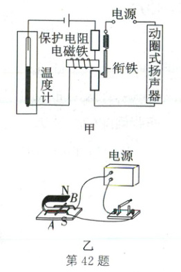 42. (2025·兰州)图甲是某蔬菜大棚里使用的一种温度自动报警器,在温度计里封入一段金属丝,当温度达到金属丝下端所指温度时,扬声器响起,发出报警信号。下列说法错误的是(