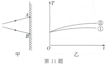 11. (2024·苏州)如图甲所示,AB 之间是太阳光经三棱镜色散后在屏上得到的彩色光带。将电子温度传感器分别放在 A、B 两点外侧,测得温度 T 随时间 t 变化的图像如图乙所示,则曲线①对应光线的特点是