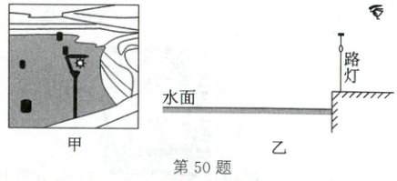 50. (2025·湖北)如图甲为校园摄影展中小芳的作品,太阳在湖中的倒影“镶嵌”在湖边的路灯中。为解释通过路灯的空隙看到太阳的像,请在图乙中画一条太阳光经水面反射到人眼的光路。(保留作图痕迹)