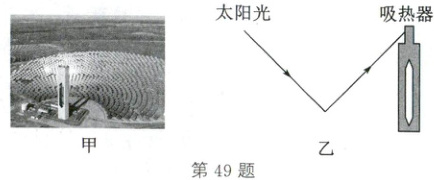 49. (2025·乐山)如图甲所示,塔式太阳能电站是把许多平面镜按照一定的规律排列起来,把太阳光反射后会聚到同一位置。请根据图乙中的光路,画出平面镜的位置并标出入射角(平面镜用“~”表示,入射角用“i”表示)。