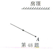 48. (2025·宜宾)一束阳光斜射入房中,小明在A点用平面镜把该光竖直反射向房顶,请在图中画出平面镜的位置和反射光线。