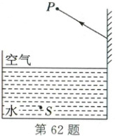 62. (2025·大庆)如图,通过鱼缸右侧上方的平面镜可观察到鱼缸中的小鱼,补充画出人眼P通过平面镜看到水中小鱼S的光路图(保留作图痕迹)。