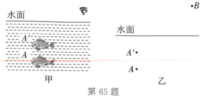 65. (2025·南充)如图甲所示为人在岸边观察水中鱼时的情景,在图乙中完成光路图。(其中A表示鱼的位置,A'表示鱼像的位置,B表示人眼位置,可以不画法线,保留作图痕迹)