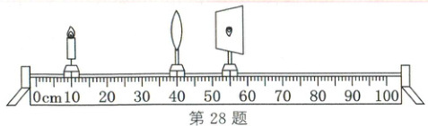 28. (2025·宜宾)(多选题)在探究凸透镜成像规律时,点燃蜡烛后,调节蜡烛、透镜、光屏的位置,直到光屏上出现清晰的像。第一次调节好后如图所示,下列说法正确的是(