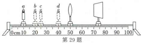 29. (2025·天津)(多选题)用焦距为15 cm的凸透镜探究凸透镜成像规律。实验中将同一蜡烛先后放在光具座的a、b、c、d四个位置,如图所示。移动光屏观察烛焰的成像情况,则(