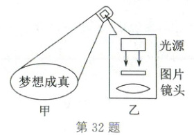 32. (2024·苏州)公共场所的宣传投影灯,装在高处的投影灯照在地面上出现图案,如图甲所示,其内部结构如图乙所示。下列说法正确的是(