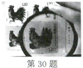 30. (2023·绥化)如图所示,小明通过焦距为15 cm的凸透镜观察到邮票正立放大的像。下列说法正确的是(