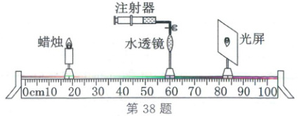 38. (2024·河南)在“爱眼日”宣传活动中,小明用如图所示的装置研究眼睛的成像,此时烛焰在光屏上成清晰的像,用此模拟正常眼睛的成像。接下来下列操作可模拟近视眼的是(