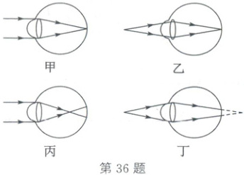 36. (2025·兰州)甲、乙两图分别是正常人眼通过调节晶状体等结构看清远处和近处物体的示意图。下列关于丙、丁两图模拟近、远视眼的情况以及应该佩戴何种透镜进行矫正的说法正确的是(