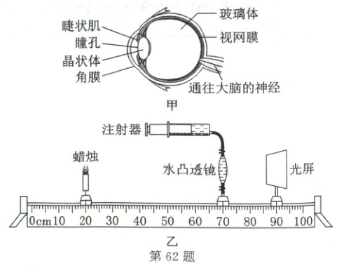62. (2025·泸州)2025年6月6日是第30个全国“爱眼日”。图甲为眼睛的结构示意图,图乙为某科学兴趣小组自制的一个用来模拟眼睛变焦过程的装置。