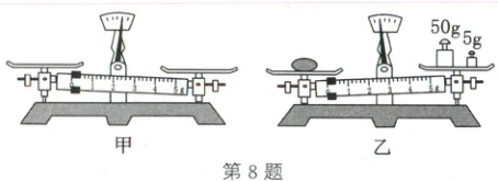 8. (2025·天津)把天平放在水平桌面上,游码放在标尺左端零刻度线处,指针静止时如图甲所示,应调节