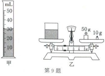 9. (2025·兰州)小明在实验室用天平和量筒测量某种液体的密度。他先在烧杯中倒入适量的液体,用天平测出烧杯和液体的总质量为 94.2 g,再将烧杯中的部分液体倒入量筒中如图甲所示,最后用天平测量烧杯和剩余液体的总质量,天平横梁水平平衡时如图乙所示,则烧杯和剩余液体的总质量为