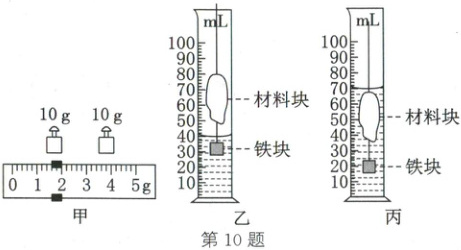 10. (2025·眉山)物理兴趣小组的同学测量一块不溶于水的新材料密度,用调好的托盘天平测量材料块质量,天平平衡时右盘砝码质量和游码在标尺上的位置如图甲所示,则材料块的质量为
