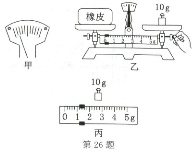 (3) 经过正确操作,横梁达到水平平衡时,右盘砝码的质量及游码的位置如图丙所示,此橡皮质量为