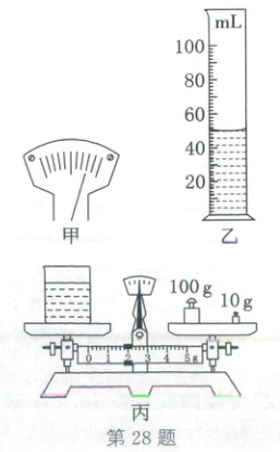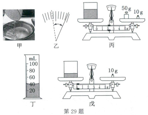 ,使横梁水平平衡。(2) 如图丙,测出面浆水和烧杯的总质量;将烧杯中适量的面浆水倒入量筒中,如图丁,量筒中面浆水的体积为
