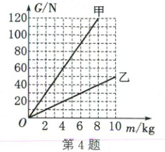 4. (2023·赤峰)小明在科技博览阅读中,查阅了不同星球上重力与质量的关系图像,如图所示。通过图像可知,在甲、乙两个星球上,重力与质量都成