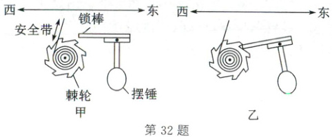 32. (2025·广州)某种汽车安全带控制装置如图甲,摆锤竖直悬挂时,锁棒水平,棘轮可以自由转动,安全带能被拉动,由此可判断汽车静止或正常行驶;如图乙,摆锤摆起时,锁棒锁定棘轮,安全带不能被拉动,由此可判断此时汽车可能(