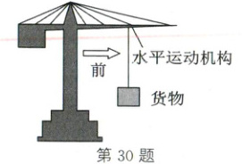 30. (2025·菏泽)如图所示,塔吊的水平运动机构用钢丝绳悬挂着货物一起沿水平方向向前匀速运动,水平运动机构突然停止时,货物(
