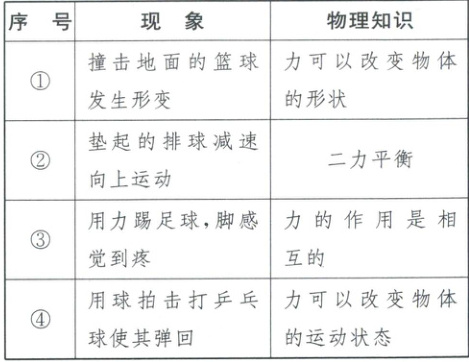 39. (2025·天津)小明用物理知识对球类运动中的现象进行分析,如表所示。所用物理知识错误的是(