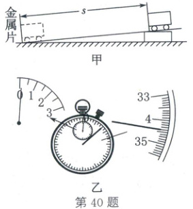 40. (2025·南充)用图甲所示装置测量“小车运动的平均速度”,每次实验小车都从斜面顶端自由释放,金属片可置于斜面的任意位置,用刻度尺测量路程,秒表测量时间,图乙是第5次记录的时间。下表是实验中收集的数据。