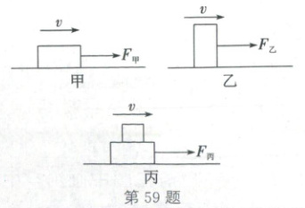 59. (2024·广元)如图,同一长方体木块先后以相同的速度$ v $,在同一水平面上被匀速直线拉动,图甲中平放,图乙中竖放,图丙中平放且在上面叠放一重物(重物与木块相对静止),木块所受的水平拉力分别为$ F_甲 $、$ F_乙 $和$ F_丙 $,则(