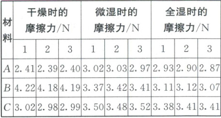 (2) 在“微湿”状态下,鞋子在材料A上受到的滑动摩擦力最小