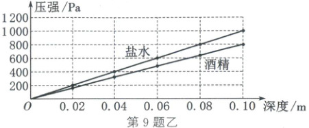 ;用酒精重复上述实验,画出图乙中酒精内部压强随深度变化的图线。比较两条图线,深度相同时,盐水的压强比酒精大