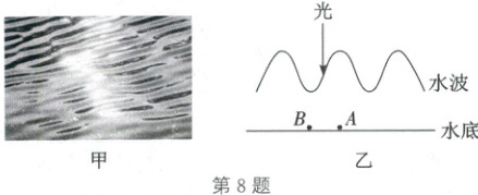 8. (2025·威海)如图甲所示,摄影师拍摄到水底有亮、暗相间的条纹,条纹随着水面波动发生变化。水波如图乙所示,若一束光竖直入射到图示位置,则相比入射光,进入水中的光传播方向