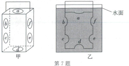 7. (2025·苏州)如图甲,在透明密闭塑料盒的上下左右四个面上开了六个相同圆孔,在孔的位置蒙上相同的橡皮膜 a、b、c、d、e、f,将它压入水中后,出现如图乙所示的现象。