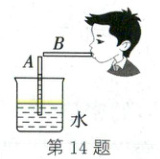 14. (2025·辽宁)如图,若某同学往吸管 B 中吹气,可以看到吸管 A 中的水面上升。由于吹气,使吸管 A 上方空气流速变