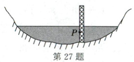 27. (2025·扬州)今年$1\sim5$月份,扬州地区降雨偏少,固定在河床上的水位尺显示水位较去年同期低。如图,水位尺上$P$点较去年同期(