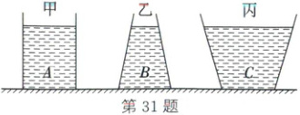 31. (2023·仙桃)(多选题)如图,质量、底面积相同的薄壁容器甲、乙、丙放在水平桌面上,甲为圆柱形,乙、丙为圆台形,分别装有$A$、$B$、$C$三种质量和深度均相同的液体。下列说法正确的是(