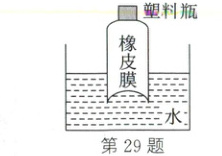 29. (2024·泰州)一敞口硬质透明塑料瓶,剪去瓶底后蒙上橡皮膜,再插入盛水容器中,如图所示,以下对有关实验现象的描述、分析正确的是($\rho_{酒精}<\rho_{水}<\rho_{盐水}$)(