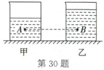 30. (2025·乐山)如图所示,水平桌面上两个完全相同的容器中分别装有甲、乙两种液体,已知$A$、$B$两点处的液体压强相等,则两种液体的密度关系为(