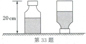 33. (2024·新疆)如图所示,一下半部分为圆柱形的玻璃瓶,深度为$20cm$,内封闭有质量为$0.30kg$的水。将玻璃瓶正放在水平面上时,水对玻璃瓶底部的压强为$900Pa$;将玻璃瓶倒放在水平面上时,水对玻璃瓶盖的压强为$1400Pa$。若该玻璃瓶内装满密度为$0.8×10^{3}kg/m^{3}$的酒精,则酒精的质量为($g$取$10N/kg$)(