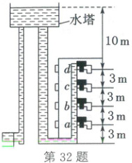 32. (2024·广州)某居民楼水塔液面与各楼层水龙头的竖直距离如图所示,若$\rho_{水}=1.0×10^{3}kg/m^{3}$,$g$取$10N/kg$,水龙头关闭时,$c$处所受水的压强为(