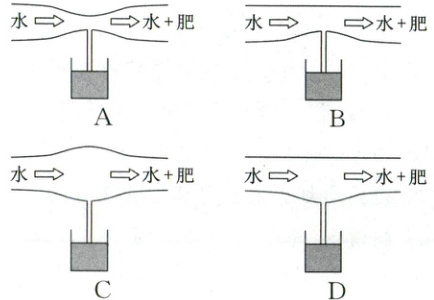 40. (2025·菏泽)小华观察发现:同一河流,狭窄处比宽阔处水流更快。受此启发,他结合所学物理知识,设计了四种装置吸取液体肥,用于学校劳动基地水肥一体化灌溉,各装置剖面如图所示。在左端管口横截面积和水流流速相同的情况下,下列设计中吸肥最快的是(
