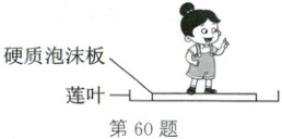 60. (2025·连云港)王莲拥有水生植物中最大的叶片,莲叶边缘上卷,在叶脉通气组织支撑下,莲叶几乎不浸入水中。王莲进入观赏期时,植物园向游客开设“莲叶载人”的体验活动。为保证安全,莲叶浸入水中的深度不能超过其边缘卷边高度的$ 25\% $。工作人员将面积为$ 1.5 m^2 $、质量为$ 3 kg $的硬质泡沫板放在底面积为$ 2 m^2 $的莲叶中央,该莲叶卷边高度为$ 16 cm $,游客站立在硬质泡沫板上,体验“一叶当舟”的乐趣,如图所示,某游客质量为$ 60 kg $,双脚站立时与地面的接触面积为$ 4 × 10^{-2} m^2 $。求:($ g $取$ 10 N/kg $,$ \rho_{水} = 1.0 × 10^3 kg/m^3 $)