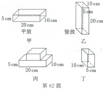 62. (2025·广元)“奔月”兴趣小组将一块长为$ 20 cm $、宽为$ 10 cm $、高为$ 5 cm $的砖块平放在电子秤上,使砖块底面与秤盘表面完全接触,电子秤示数为$ 2.0 kg $,$ g $取$ 10 N/kg $。