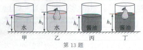 13. (2025·北京)某同学利用一个圆柱形容器、一个梨、记号笔、刻度尺和适量的水测量酱油的密度,测量过程如图所示,图中h₁、h₂、h₃、h₄分别是梨放入水、酱油前后液面到容器底的距离。已知水的密度为ρ水,则待测酱油的密度ρ酱油=