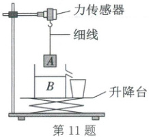 11. (2025·重庆)小渝同学将重 1 N、底面积为 200 cm² 的薄壁圆柱形溢水杯 B 放在水平升降台上,如图所示,内装 17 cm 深的水,则溢水杯对升降台的压强为