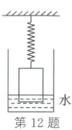 12. (2025·辽宁)如图,装有适量水的柱形容器静止在水平桌面上,不计质量的弹簧悬挂一不吸水圆柱体,圆柱体浸入水中 3 cm 且处于静止状态,此时弹簧伸长量为 8 cm。现向柱形容器注水,注水过程中圆柱体缓慢上升,当弹簧恰好恢复原长时,停止注水,圆柱体静止。注水量为 2.76 kg 且水没有溢出。已知:圆柱体高 20 cm、底面积是 100 cm²,柱形容器底面积是 200 cm²。容器中的水面与注水前相比升高了