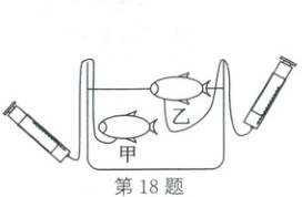 18. (2025·菏泽)小华在相同气球内装上不同配重做了两个“小鱼”。“小鱼”甲的质量大于“小鱼”乙的质量。注射器可以通过连接“小鱼”的软管对“小鱼”进行抽气和充气,从而改变“小鱼”的体积。初始时,两“小鱼”在水中处于静止状态,如图所示。忽略空气重力及软管对“小鱼”的作用力。“小鱼”所受浮力分别用$F_{甲}$、$F_{乙}$表示。下列说法正确的是(